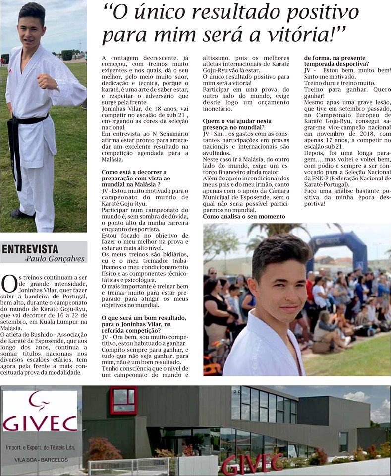 O atleta da BAKE-Bushido Associação de Karate de Esposende, Joninhas Vilar, esteve presente em mais um Treino Nacional de Seleção, que decorreu no sábado, dia 17 de agosto, no Centro de Alto Rendimento do Jamor. No mesmo local, também esteve presente Jonathan Horne, atual campeão do mundo de kumite +84kg, no âmbito do Programa de Preparação Olímpica - Tóquio 2020.